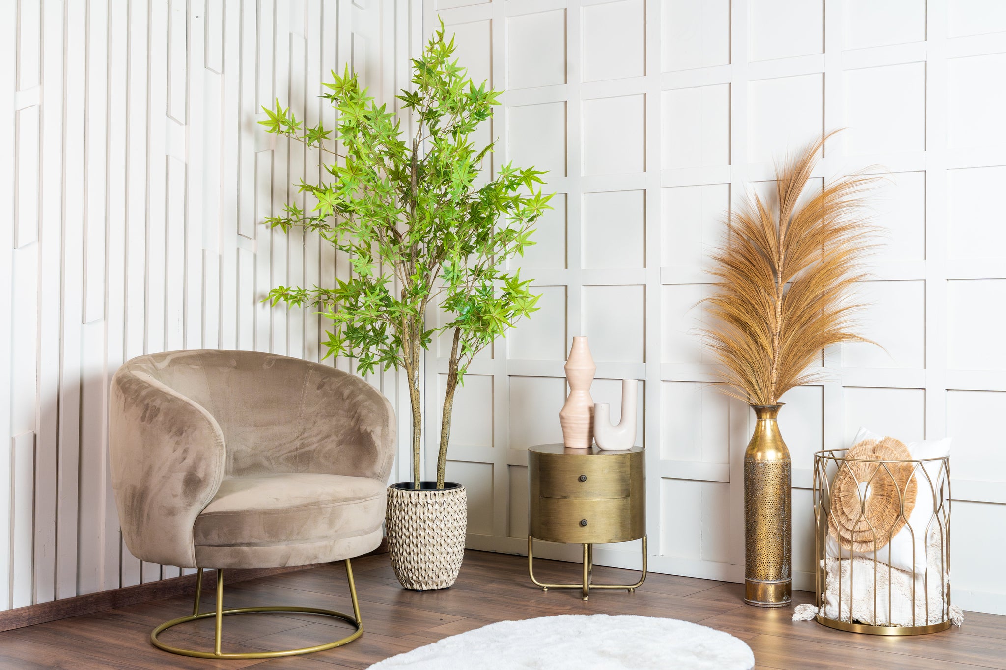 De stevige stam en volle bladkroon geven de plant een robuuste uitstraling, terwijl het luchtige bladwerk zorgt voor een frisse en lichte sfeer. Dankzij het gebruik van hoogwaardige materialen behoudt de kunst Esdoorn jarenlang zijn kleur en vorm, zonder dat er water, snoeiwerk of zonlicht nodig is.